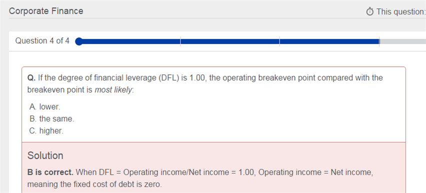 查看试题 已回答When DFL = Operating income/Net income = 1.00, Operating income = Net income, meaning the fixed cost of debt is zero.这一句话对吗?