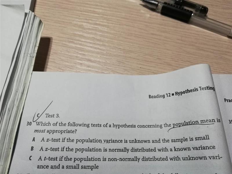 已回答你好,这个题目是原版书第50页第30题,t-test和z-test有什么不同?我们之前学过正态分布,里有一个t分布,也是一个正态分布吧,为什么有t分布?关于z这里是不是指我们学过对正态分布的随机变量进行标准化?相当于调整过为标准正态分布下的z?而本题是关于总体均值的假设检验,那不是用到公式,样本统计量-总体参数的假设值,然后再除以统计量的标准误差标准误就是总体标准差除以样本容量平方根的比率,那就需要知道方差(再开根号求出总体标准差),所以就选B,我不太理解,但是就是单纯从公式去需要知道方差,就排除了a和c,但是从上一节对t分布还有非标准正态z那里开始就不是很理解了,导致这里的假设检验更难理解,只能硬记一点,请帮忙说明,谢谢!