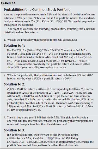 查看试题 已回答教材P261-Example 6-(1)Solution to 1-为什么因为是continuous distribution,就表示P(Z > x) = P(Z ≥ x)?教材第几页上有提到过这个知识点?(2)另外,为什么P(Z ≥ x) = 1.0 − P(Z ≤ x)or 1 − N(x)?教材第几页上有提到过这个知识点?(3)为什么P(Z ≤ x) = 1 − N(x)?P(Z ≤ x) 代表什么含义?(4)Solution to 2-为什么P(12% ≤ Portfolio return ≤ 20%) = N(Z corresponding to 20%) − N(Z corresponding to 12%)?这个表达式,请问怎么理解?另外第2行开始的,为什么N(0.363636)=NORM.S.DIST(0.363636,1)?前者是服从正态分布,后者是将标准差()的数量转换为累积概率。