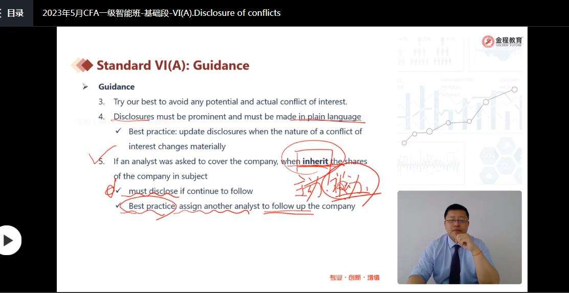 在这里 ,老师着重强调了要向客户进行披露,但是,这里是不是也应该向雇主进行披露啊?在VI(A)里面存在利益冲突的时候 ,需要注意区分是向雇主进行披露还是向客户进行 披露,还是都要披露的情 吗,感觉有时候应该既要向客户披露又要向雇主披露 ,这个要做专门的区分吗?
