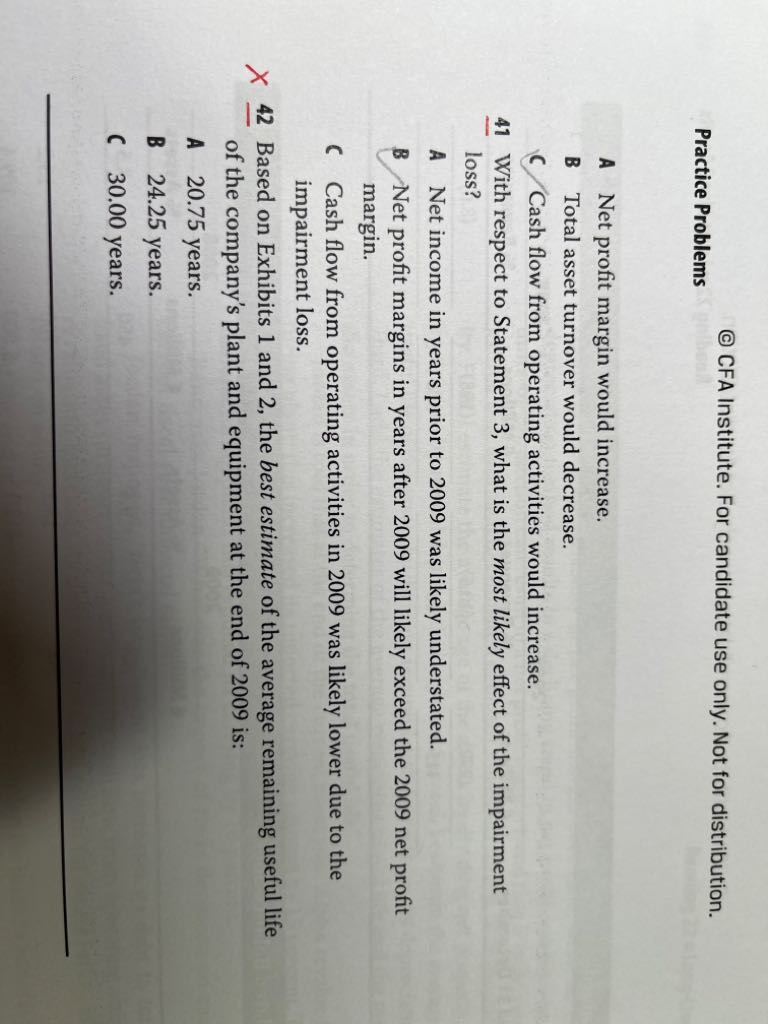 41题,a选项没看懂原版书的解析。如果当期有inpairment loss,那之前年份资产的carrying amount应该更高,折旧更高,ni是偏低的?c选项,也不太懂,为什么对cfo没影响?