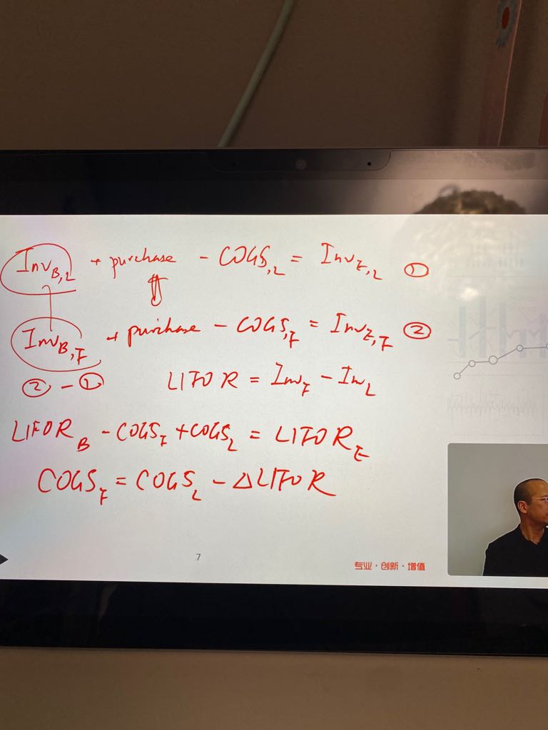 ΔLIFO R不是应该等于期末LIFO R 减期初吗?因此LIFO R期初减期末应该等于负的ΔLIFO R,因此,公式应该是COGS f=COGS l+ΔLIFO R?