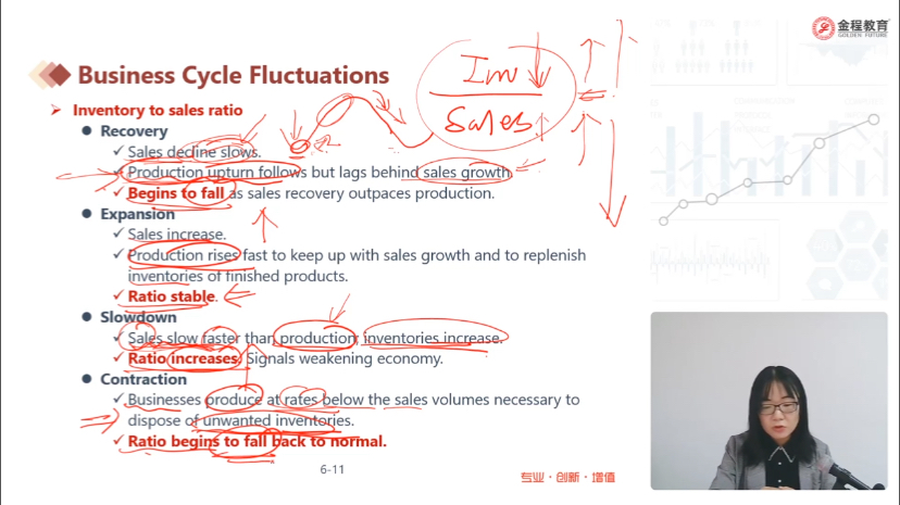 衰退阶段,销售停滞,库存滞压得更多,比率应该是最高啊?恢复正常是什么意思?