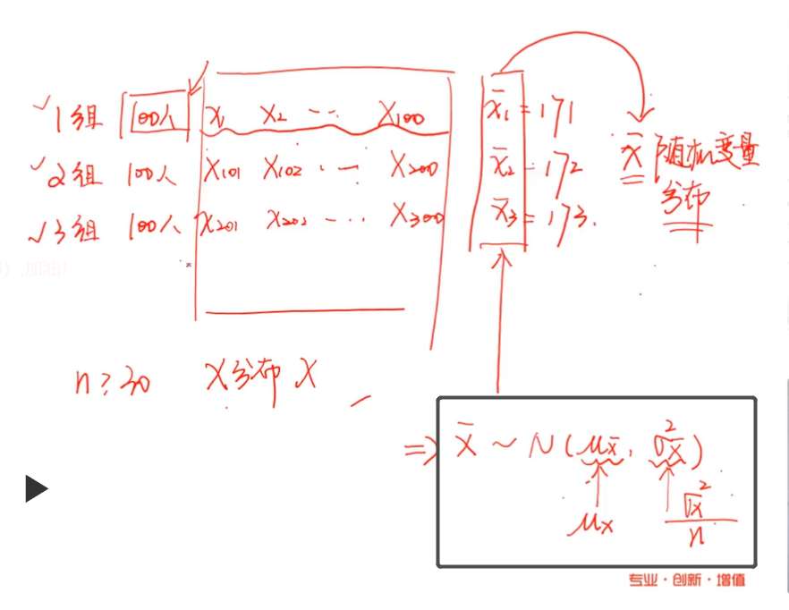 看上述视频的时候,在理解方面出现了疑问。如果图所示,从大于总样本数N(N>30)中抽取多个样本n,并且组成样本组1,样本组2,样本组3·····样本组n,样本组1中X的均值记作X1,样本组2中X的均值记作X2,样本组n中X的均值记作Xn, 样本组1中方差σ记作σ1+样本组2中方差σ记作σ2+····样本组n中的方差σ记作σn. ①这里的μx'计算是否是用样本组1中的X的均值X1'+样本组2中X的均值X2'+样本组3中X的均值X3'·····+样本组n中X的均值Xn'的总和,(X1'+X2'+X3'+·····Xn')/样本组总数n,结果μx'趋近于服从正态分布的均值μ?如果μx'的计算方法错误,正确的计算方式是什么? ②x'的方差(σx')^2为什么要除n,这里的n代表的时抽取的样本数n,还是总样本数N? ③ (σx')的计算方式是否为:(σ1+σ2+····σn)/样本组总数n? ④如果③的计算方式错误,那么正确的计算方式是什么?