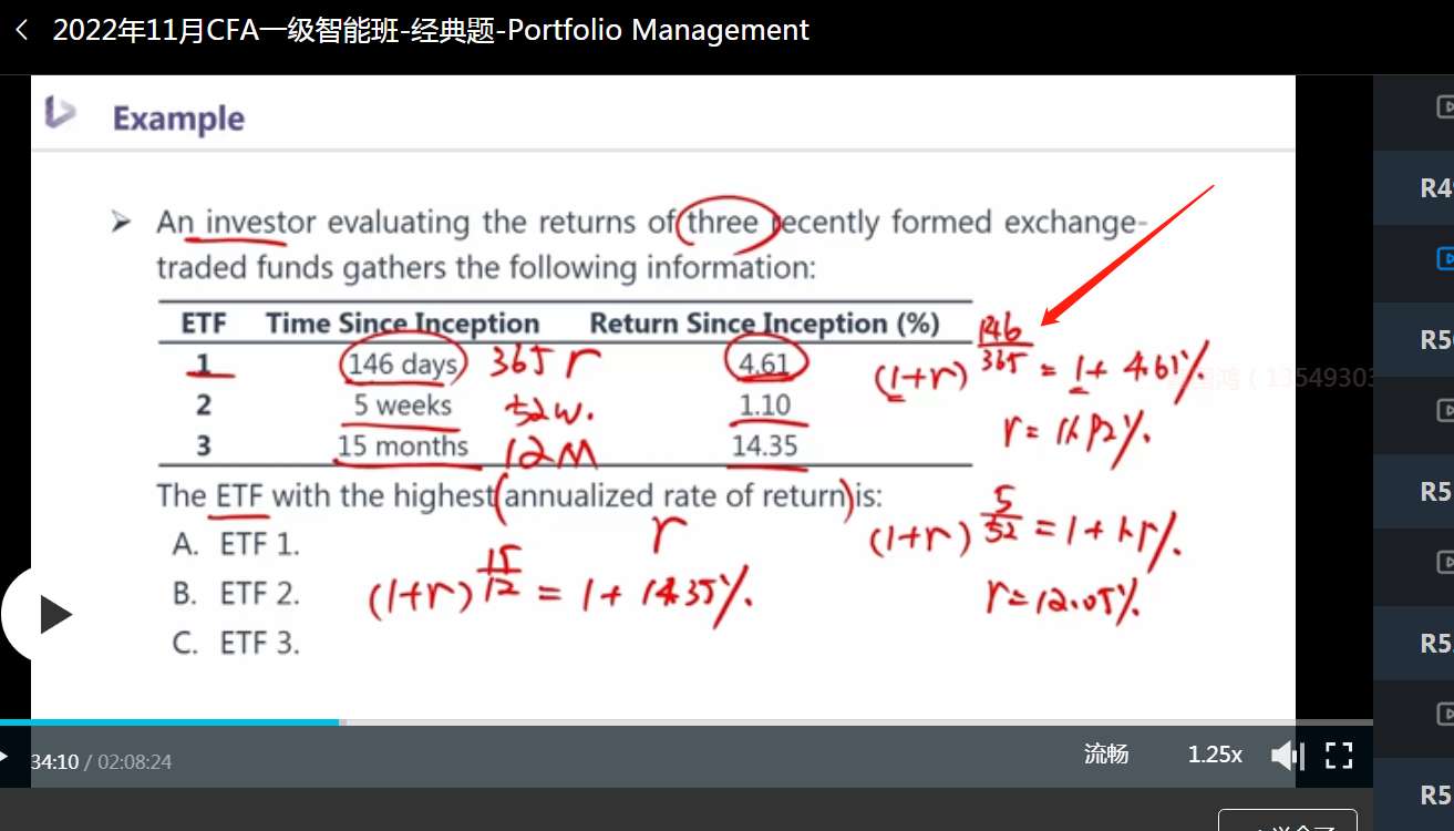 老师,这里是不是应该是(1+0.0461)^(365/146),而不是(1+0.0461)^(146/365),毕竟这0.0461是这146天的总收益,而要算年化的就是365/146,看看365天里面有多少个146天,就有多少个0.0461.