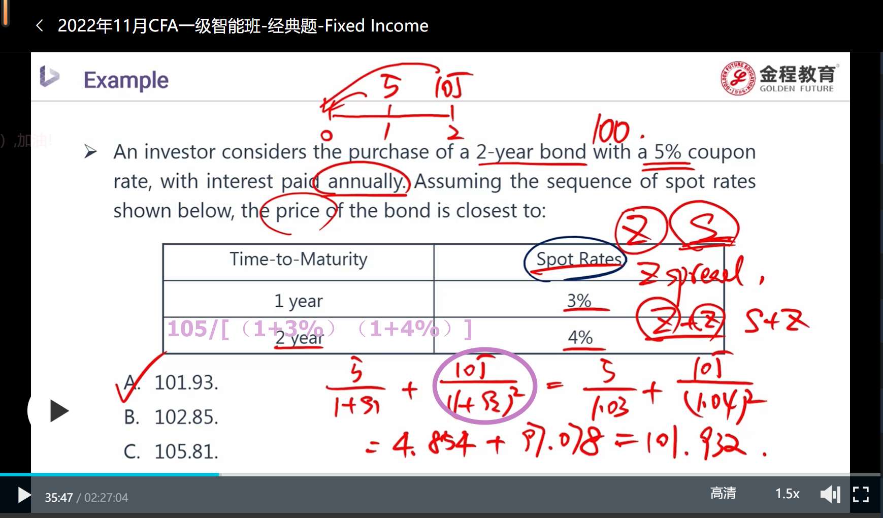 老师,我对spot rate的理解好像有误,在算第2年的CF的时候我是按图片中的紫色来算的,不知道如何理解spot rate
