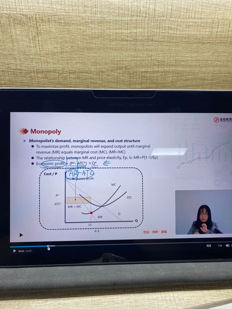 求经济利润,为什么P*取值在MR=MC的延长线投射在Qd上?为什么Qd可与MC与ATC min相交?而MR不能与MC与ATCmin相交?类似于完全竞争市场的长期状态、只不过需求曲线和MR更陡峭?