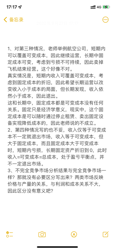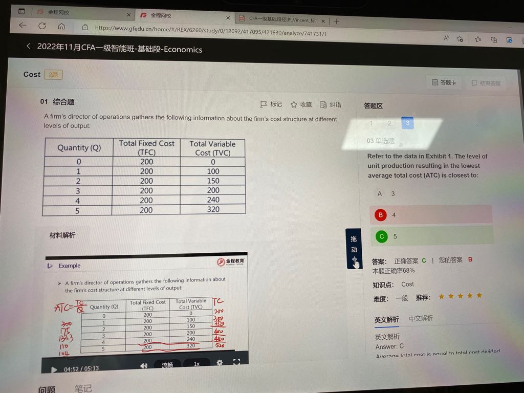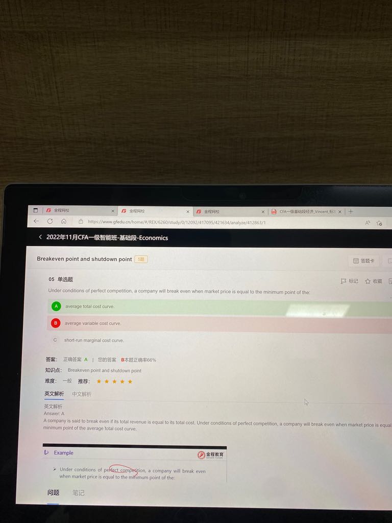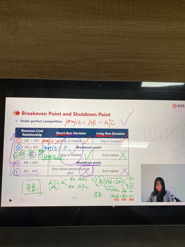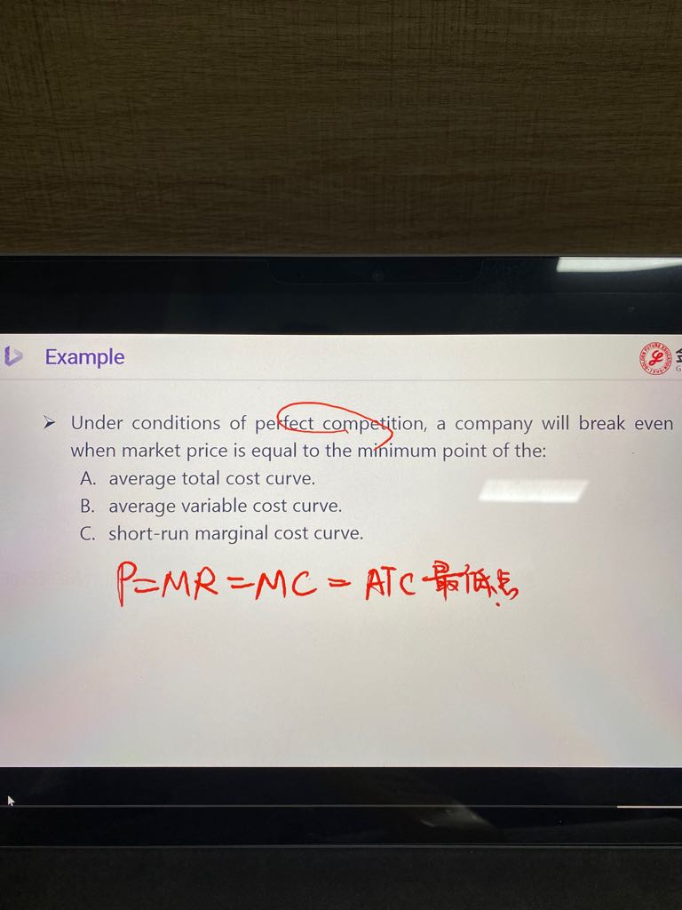 1、完全竞争市场:P=MR=AR,盈亏平衡:AR=ATC,说P=MR=MC,似乎不对?MR=MC是利润最大化;2、答案A说P=ATC的最小点是盈亏平衡点,不应该是P等于ATC任何一点都是盈亏平衡点?