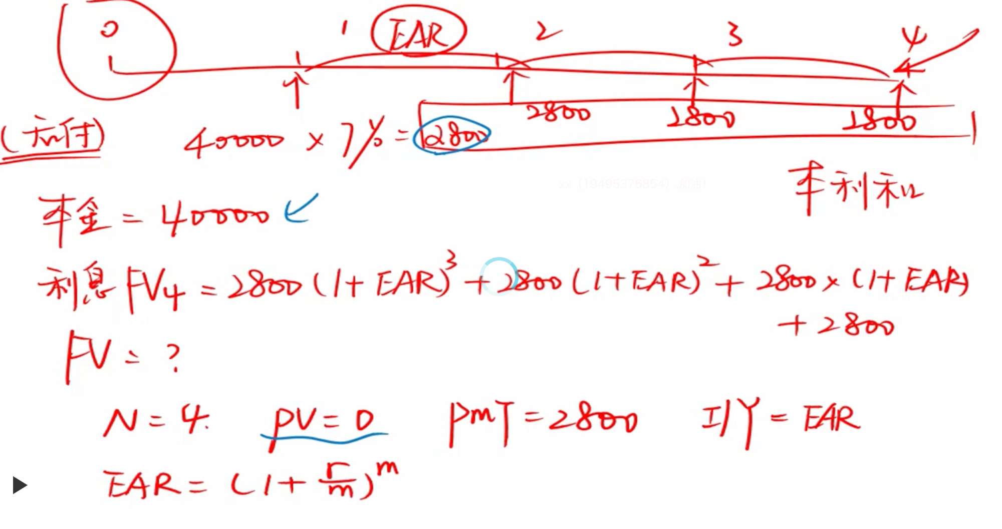 第13题,不算EAR,为什么我的式子PV=0,I/Y=4/12,PMT=2800/12,N=48不对?