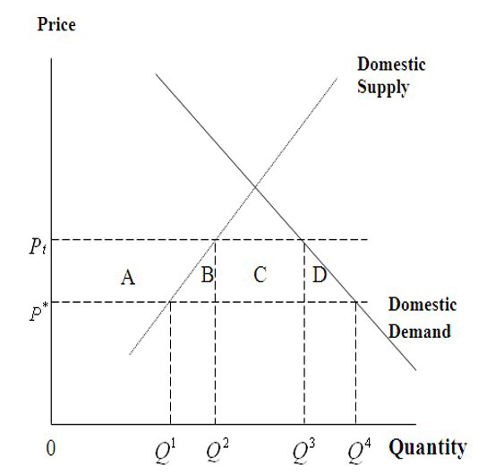 老师 可以解释一下为何A是生产者剩余,C部分是关税,B和D是社会福利损失呢
