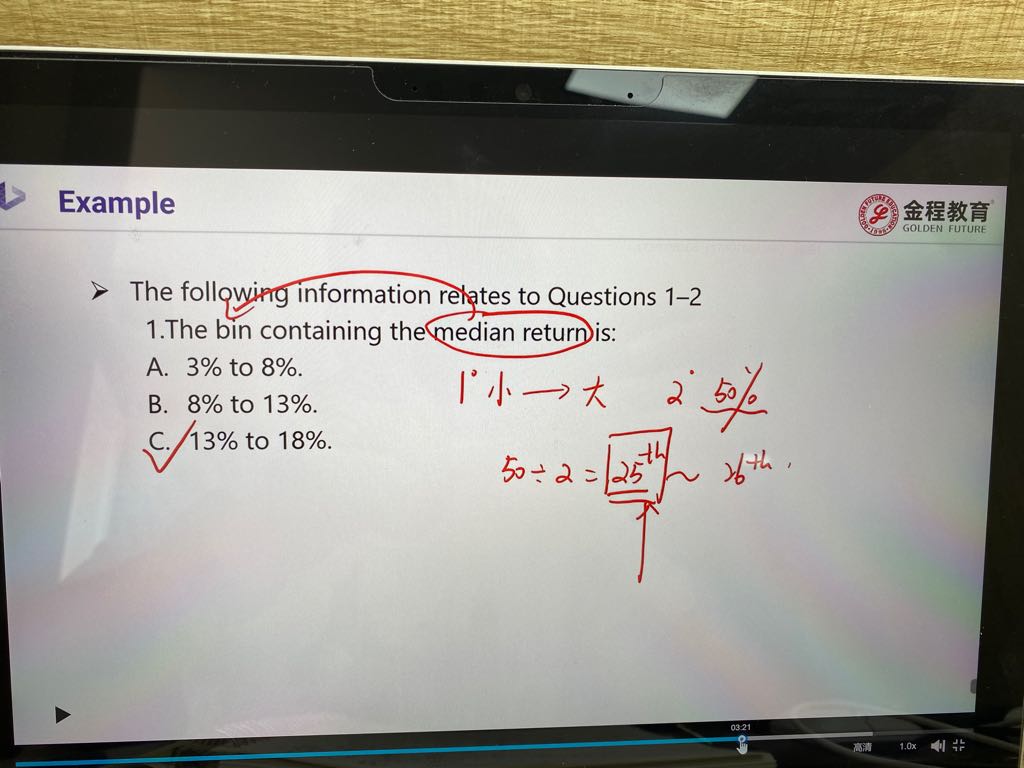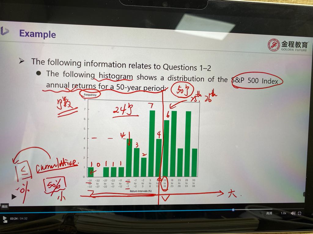 说50年所以50个数据从大到小排序求中位数是第25-26之间,但-32%~-27%的频率是0,也就是这个区间不存在数据,因此只有49个数据排序,中位数就是第25个?