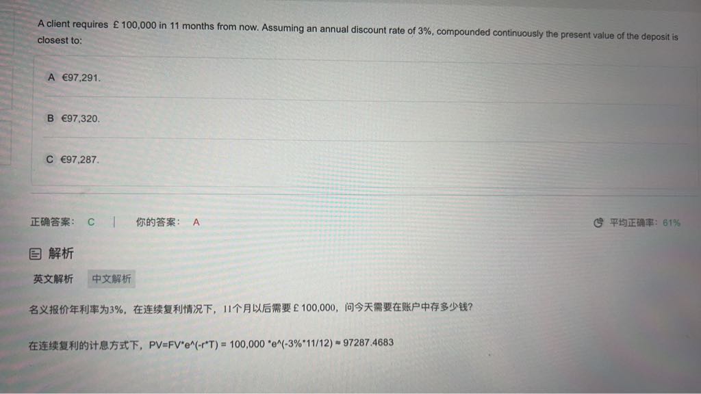 我输入:I/Y=3%/12=0.25;N=11,FV=100000,PMT=0,算出来PV=97291,麻烦帮我看看哪里错了呀。