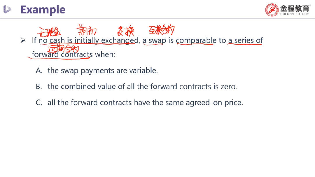 这个题的第一句说,一开始没有现金交换,提供了个什么信息,还有a选项老师举的例子是支固定收浮动才是错的,那如果用支浮动收固定,那a不就对了嘛