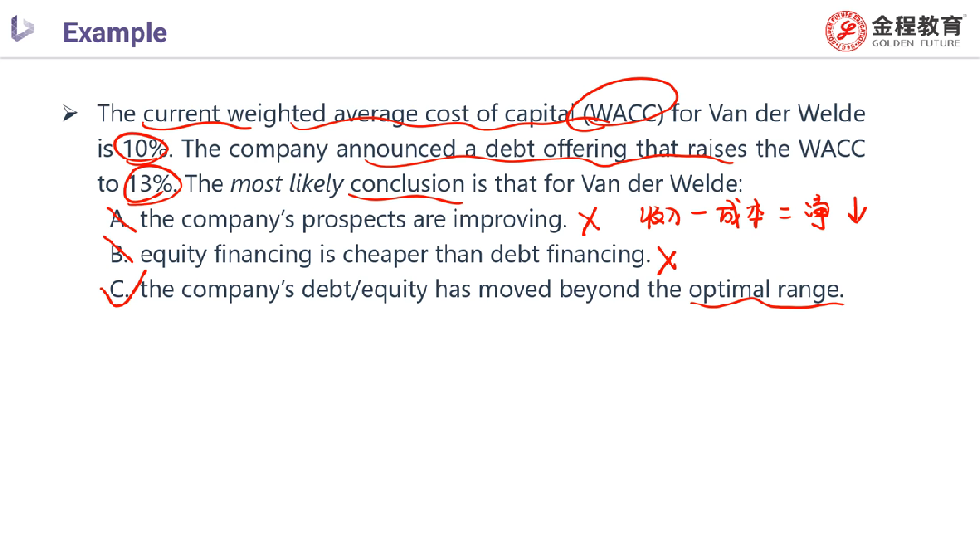 这里这道题,C选项是对的,但是感觉A选项,增加了WACC也就是负债变的更高了,那不就等于公司有信心承担更高的债务吗?