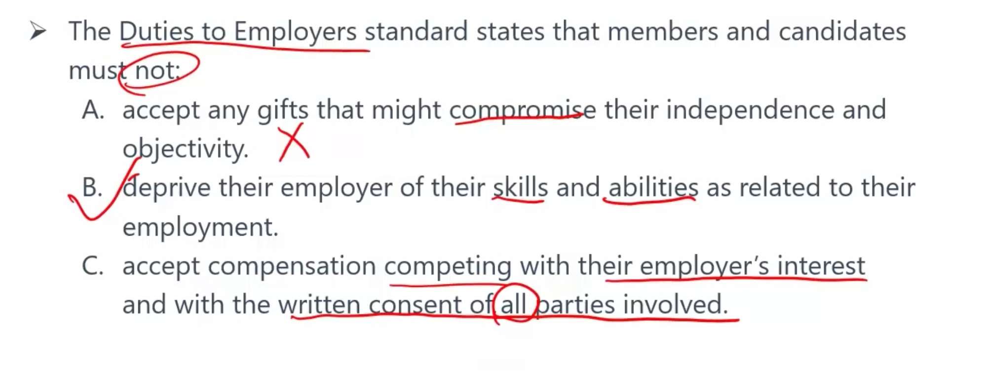 B选项说的啥意思?剥夺技能是啥意思?C选项难道不是competing with ... and (competing) with written consent吗,就是和大家的written consent竞争