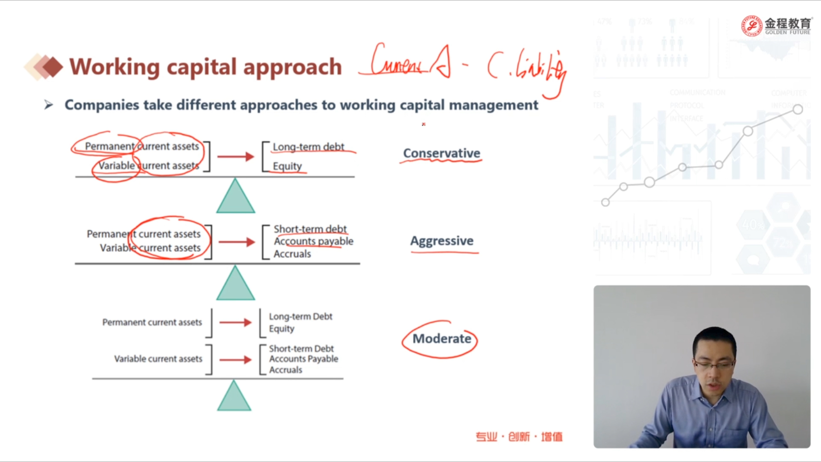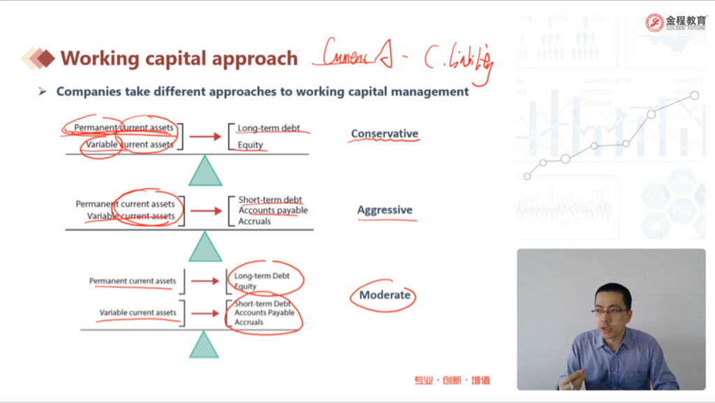 老师,我这个地方听的很迷糊。上页ppt 说保守方法是current asset多,debt是长期的,激进方法是current asset少,债是短期的。然后这一页ppt,老师又讲到说,
