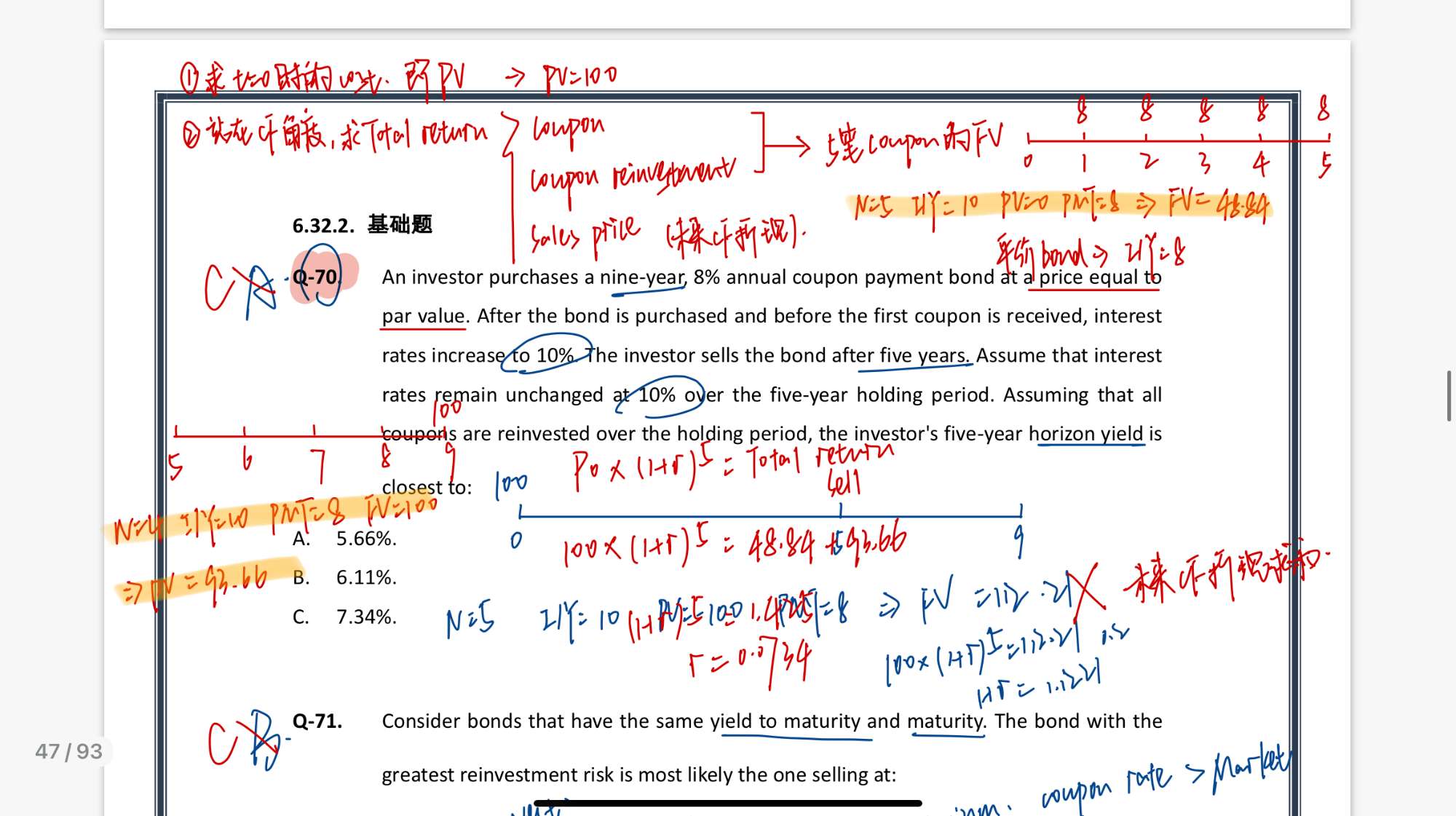 第70题,不是说只能用未来现金流折现求PV吗,所以在求PV5的时候,要用第五年到第九年这一段来求PV5,不能用1到5这一段来求FV5;那为什么在求coupon和coupon-reinvestment的时候,为什么可以用1到5来求FV呢?