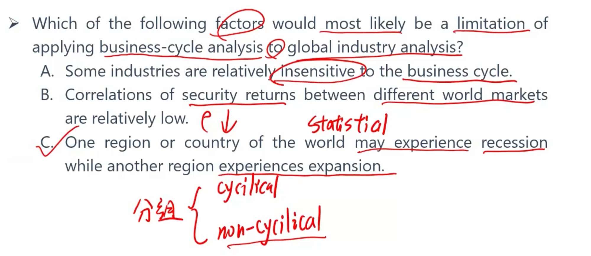 A选项,正因为不是所有行业都是符合business cycle,所以不能用来去做全球产业分析呀。C选项,如果有不同,那可以根据不同地区不同的business cycle去进行分析呀。