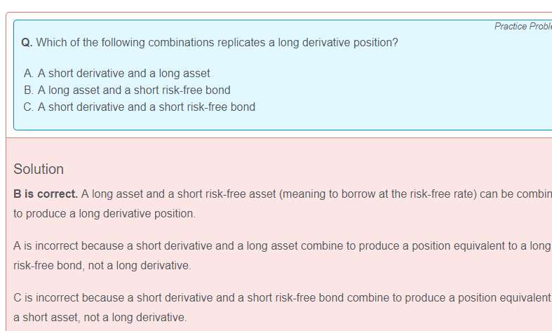 老师,这道题所涉及的知识点没太学清楚,各个long short 资产、衍生品还有无风险债券他们之间的转换关系是什么呀