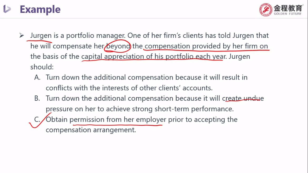 课上讲过,根据I(B)的要求,在完成业绩后给fund manager的小费可以收,完成业绩前的不能收。这道题虽然考的是额外收入,但是不也是fund manager完成业绩前吗,为什么可以收?