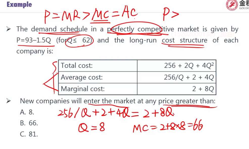 1.长期均衡,P=MC, 93-1.5Q=2+8/Q,Q=9.5789,P=78.63; P=AC, 93-1.5Q=256/Q+2+4Q, Q1=3.5938, Q2=12.95, P1=87.6093, P2=73.5645, 这两个也是长期均衡的指标,为什么只用MC=AC这个条件去计算? 2.为什么最后结果一定要带回MC=2+8×8=P,而不是带入P=93-1.5×8=81