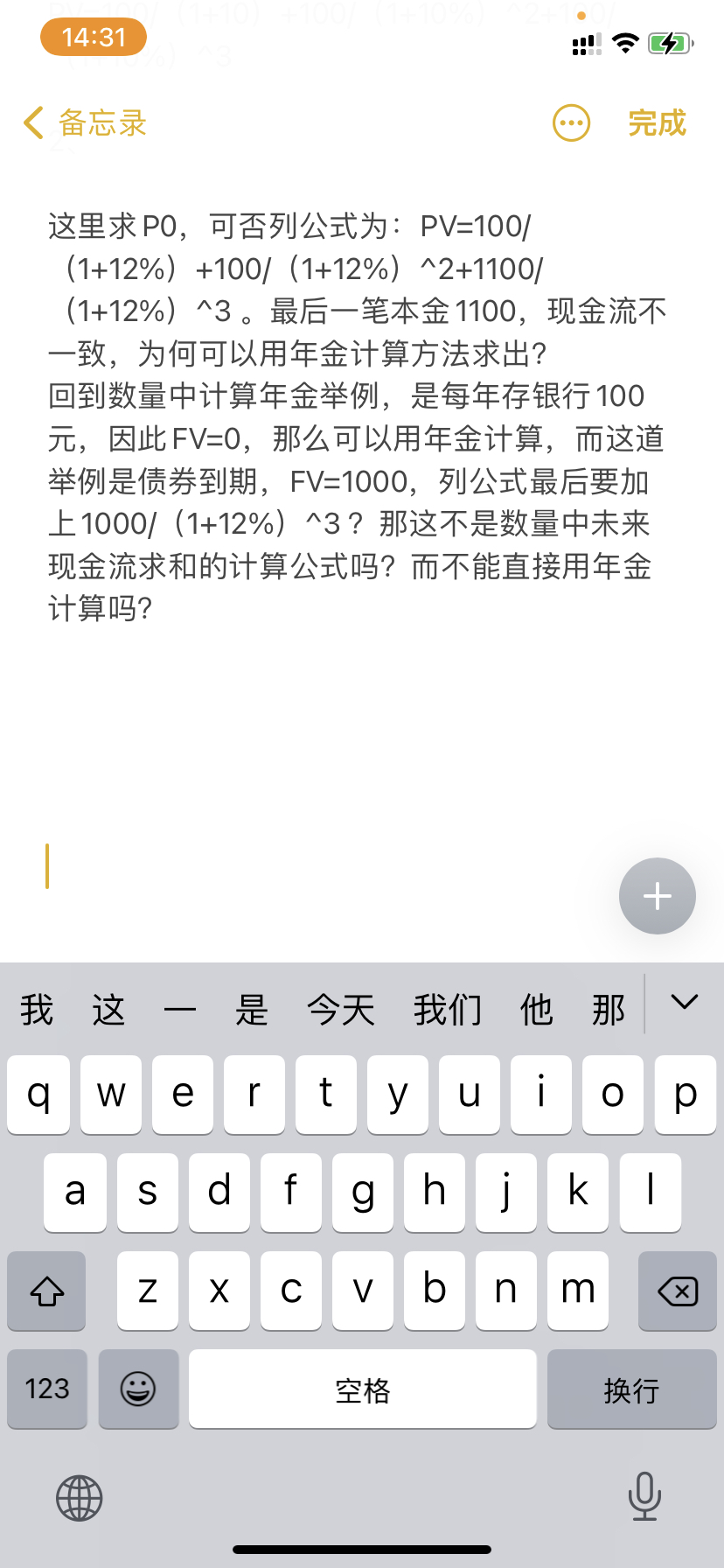 这里求P0,可否列公式为:PV=100/(1+12%)+100/(1+12%)^2+1100/(1+12%)^3 。最后一笔本金1100,现金流不一致,为何可以用年金计算方法求出?