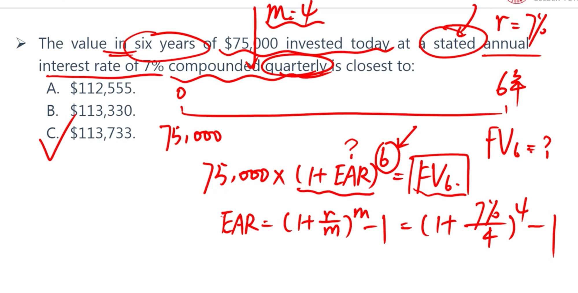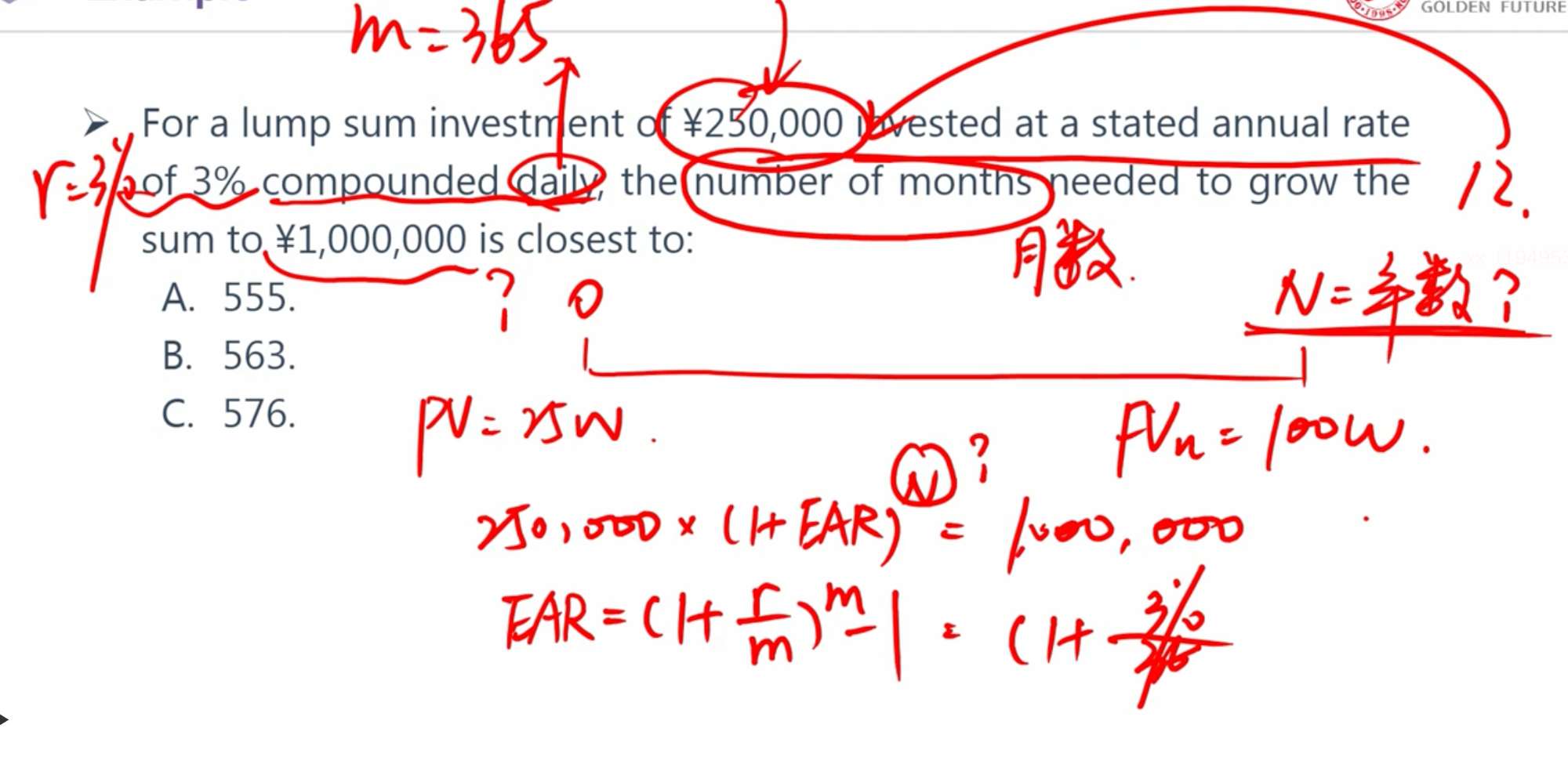 这两道题,如果用金融计算器,第二张图是按EAR算,PV=75000,I/Y=EAR=7.19,PMT=0,N=6,算出FV=-113759选项中就没有了。但如果按照PV=75000,I/Y=7/4,PMT=0,N=24,算出FV=-113733。如果第一张图按I/Y=3/365算而不是=EAR,PV=-250000,I/Y=3/365,PMT=0,FV=1000000,算出N=16906.72,除以30就是563.55选项中也没有