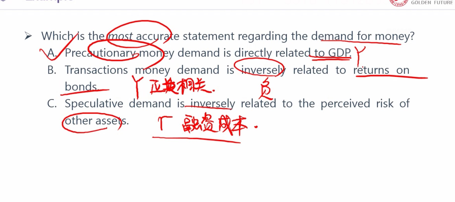 C项麻烦老师讲一下,speculative demand是指投资货币需求么?组合中的资产有货币性投资,还有其他资产,其他资产的risk上升,获得高收益可能性上升,投资需求上升,对货币投资需求下降。所以选项是inversely realted?