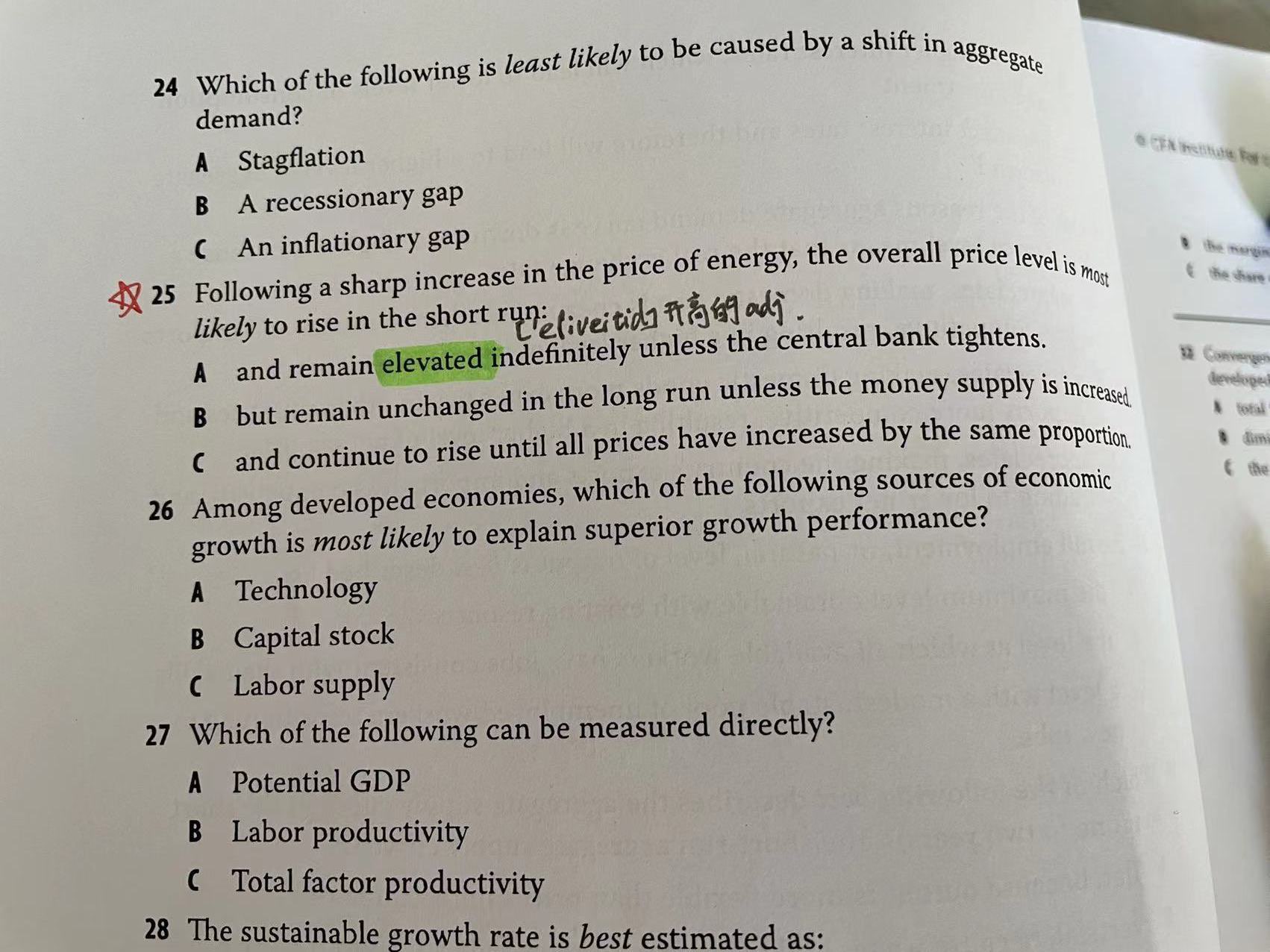 选项A好理解,就是含权债券现金流变动实际上就是行权了,也就是利率变动影响价格,价格变动会影响债权人判断是否需要行权这个应该是有效久期的一个应用。 但是C有点不开好理解。主要是课程大概35分钟的时候其实老师有提到,有效久期一般不用于预测,是因为他的计算方法是在已经有了 利率的变动,和在此影响下的价格V+和V-所计算出的久期。而久期的目的本身就是为了衡量利率变化对价格变化的影响V+和V-都有了就不需要去计算久期了,所以称之为事后久期的概念(有点类似于YTM这个概念)。所以选的时候看到is calculated from past(即计算自过去价格变动)会判断是正确的。 这个是原版书的原话么。我记得老师说过有效久期如果是预测,用的是类似于YTM的同类可比的概念,因为没有细说我理解上就是使用一个同类债券的有效久期,然后来推测出利率变动情况下对未来价格的影响,从而判断行权与否。所以应该是计算自(未来价格对收益的影响)。所以C不正确,我不知道我这么理解对不对。 如果是预测那肯定推测未来价格对收益的影响。但是这句话用的“ is calculated from“意思是计算依据,而不是预测。那有效久期就是已有的利率和价格计算而来。实在是有点晦涩难懂。 可能是某个因为单词没理解对吧。
