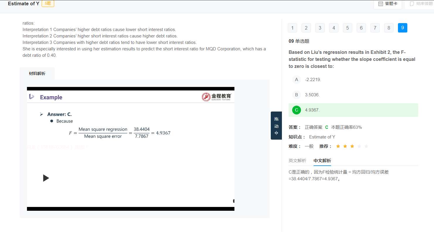 老师,第9小题的知识点在哪里?C是正确的,因为F检验统计量 = 均方回归/均方误差=38.4404/7.7867=4.9367。
