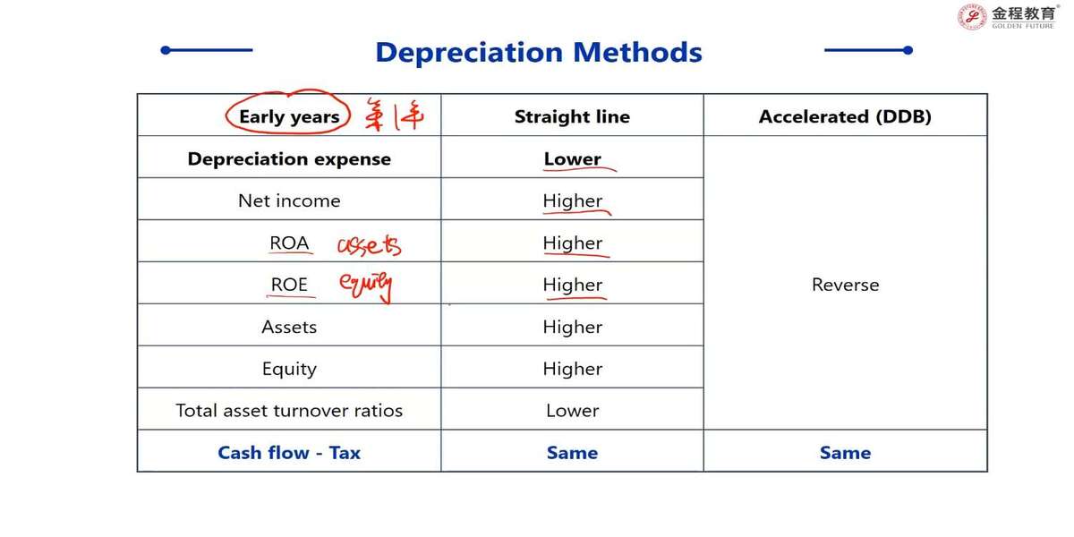 这里直线折旧法下第一年的net income是比加速折旧的高,但是也会让账面资产偏高,那为什么ROA就一定是higher?