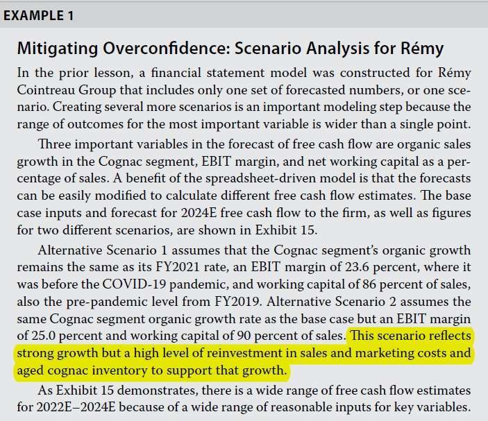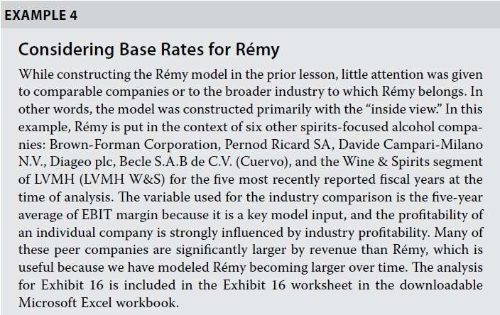 根据本页PPT讲解的representatiness bias知识点,我的提问是:书P195-Example 4-Exhibit 16的哪些数据,可以得出答案中的这个结论 though they are substantially higher than the past five years of profitability for Rémy itself. 截图中另一句标黄的结论,是通过表格中的哪些数据得出的结论?Remy management’s objective of 33 percent operating margin in 2030 appears high relative to those of its peers; only one company, Brown Forman, has achieved that level of profitability, on annual revenues ~3.0× that of Remy.