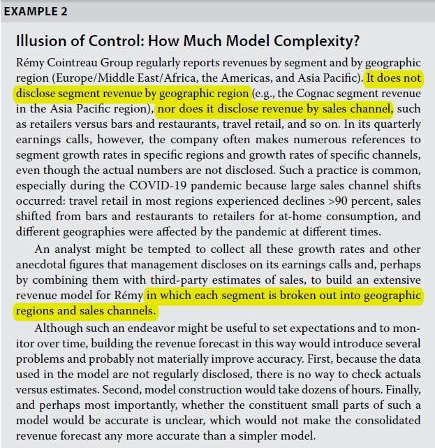 根据本页PPT的illusion of control知识点的讲解,我的提问是:书P192-Example 2-这道例题,没看明白,第一段写着does not disclose segment revenue by geographic region, nor does it disclose revenue by sales channel,即:不按地理区域披露分部收入,也不按销售渠道披露分部收入。但是当中一段又说build a revenue model in which each segment is broken out into geographic regions and sales channels? 怎么又需要把分部拆分为geographic region和sales channel了?