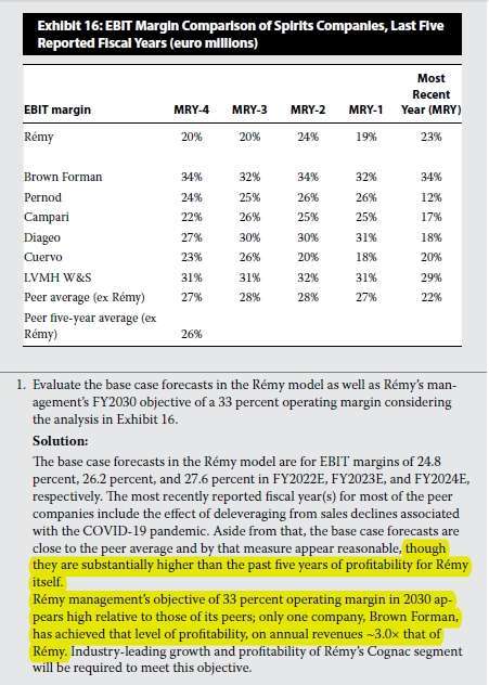 根据本页PPT讲解的representativeness bias知识点,我的提问是:书P195-Example 4-Exhibit 16的哪些数据,可以得出答案中的这个结论 though they are substantially higher than the past five years of profitability for Rémy itself. 截图中另一句标黄的结论,是通过表格中的哪些数据得出的结论?Remy management’s objective of 33 percent operating margin in 2030 appears high relative to those of its peers; only one company, Brown Forman, has achieved that level of profitability, on annual revenues ~3.0× that of Remy.