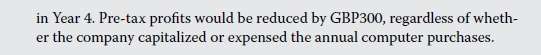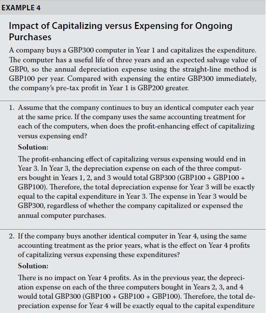 根据本页PPT的视频讲解,我的提问是:书P412-Example 4-第1问solution最后一句话,为什么无论资本化还是费用化,第3年的费用都是300?如果费用化的话,折旧300,加上购买设备支出的300,第3年总共的费用应该是600啊?资本化,应该怎么处理?第2问,也解析一下。