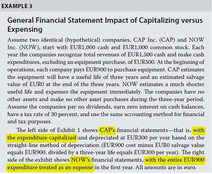 根据本页PPT的CFI知识点的讲解,我的提问是:书P410-Example 3-1. Exhibit 1,这900块钱用于购置固定资产的支出,为什么在CAP公司下算作CFI?而在NOW公司下不算作CFI?CAP公司是将这900块钱资本化,为什么记入CFI?NOW公司是将这900块钱费用化,为什么不记入CFI?2.第1问,为什么Neither company reports higher total net income or cash flow over the three years?CAP 3年的net income都是490,NOW 3年的net income分别是70,700,700 为什么不能比较大小?NOW后两年的net income不是比CAP高吗?3. 为什么说CAP reports higher cash from operations by an amount of EUR900?Exhibit 1表格中,两家公司的cash from operations,差额并不是900?790-70=720,790-700=90。4.note中的这句话也没看懂,怎么理解absent the assumption of zero interest on cash balances, expensing the EUR900 would have resulted in higher income and cash flow for NOW because the lower taxes paid in the first year (EUR30 versus EUR210) would have al owed NOW to earn interest income on the tax savings.