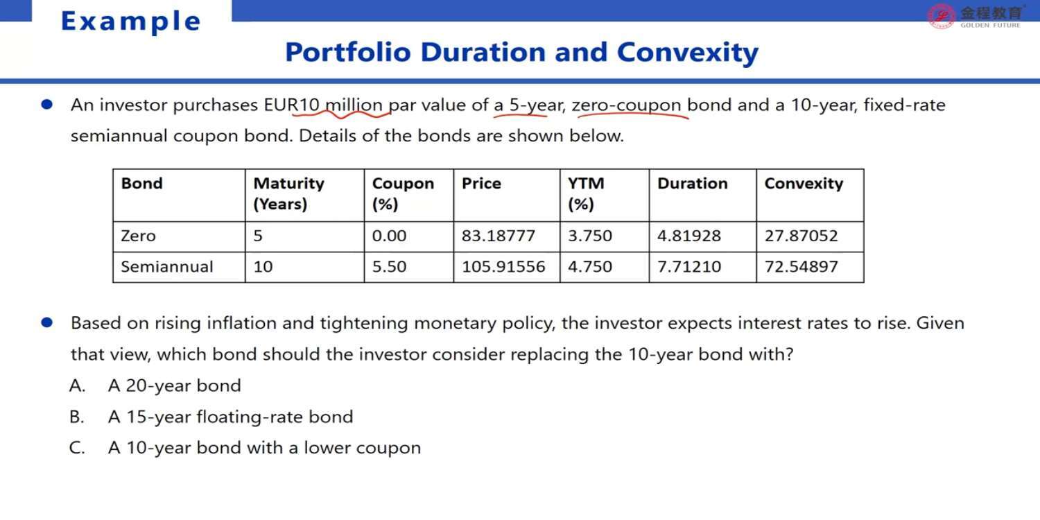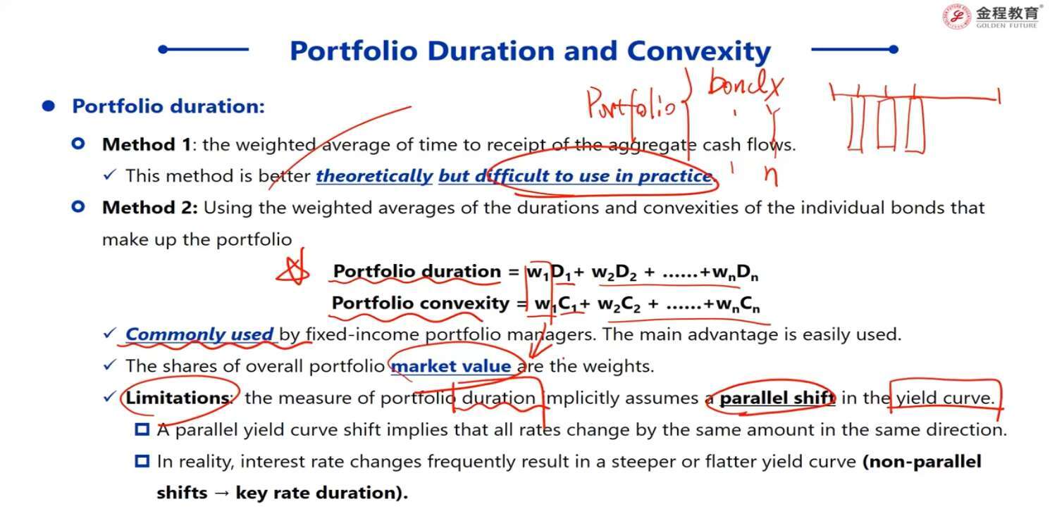 我理解老师这里的意思,就是对于组合中,可能有多个债券,只有多个债券,所以到期日不同,所以对应的就是yield curve上不同到期日上的利率 yield对吧? 但是久期讨论的是利率变化一单位,债券价格的波动程度. 虽然不同时点上,yield的变化会有所变化,但是现在假设的是利率都变化一单位,求组合的债券价格变动,所以和不同时点上 yield 变化没有关系吧. 不是已经假设利率变化一单位,那就等于1 年期债券、2 年期债券....n年期债券,对应的 yield 变化一单位,那么整个组合的价格变化多少.另外个问题,就是这里提到的非平行移动/平行移动只是用于计算组合的久期或凸性对吧? 如果是单个债券,就不存在讨论平行和非平行的吧?因为单个债券就是确定一个时间点上的 yield 的,是吗