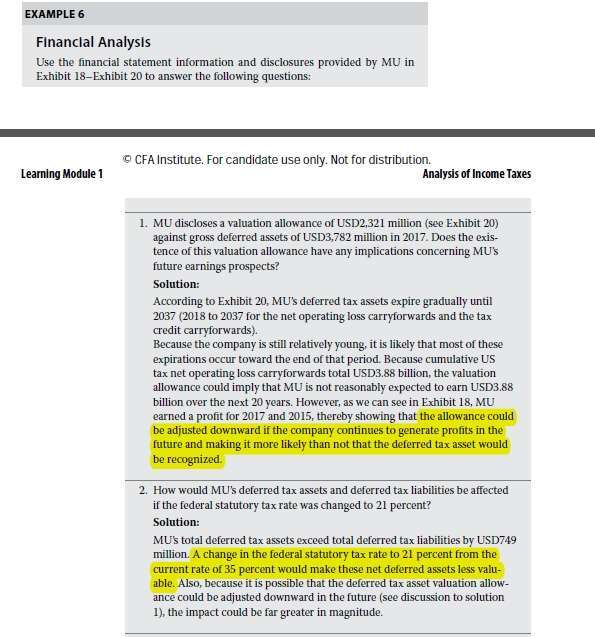 查看试题 已回答根据本页PPT讲解的tax loss carry forward知识点,我的疑问是:书P28-Example 6-Question 1-怎么理解第1问的最后一句话:the allowance could be adjusted downward if the company continues to generate profits in the future and making it more likely than not that the deferred tax asset would be recognized. 这段话什么意思?Question 2-为什么联邦法定税率从35%降到21%,会使DTA的价值下降?Question 3-这个income tax provision变动额是64million,是哪张表里的数据,我只看到Exhibit 21里的change in valuation allowance是64. 为什么valuation allowance增加,会使得income tax provision增加?income tax provision既包括current tax, 也包括deferred tax=△DTL-△DTA?Question 4-为什么The higher the acquiring company’s tax rate, and the more profitable the acquirer?这个tax rate是折现率,在分母上吧,那么它增加的话,估值金额会变小而不是变大?最后一句话怎么理解:为什么税率较高的收购者会比税率较低的收购者愿意支付更多的钱?