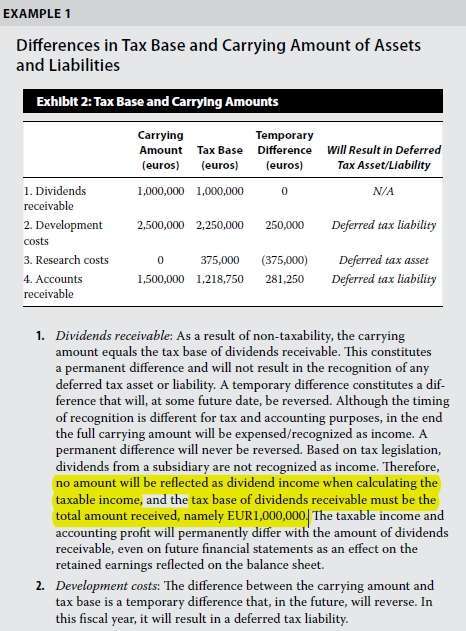 根据本页PPT的视频讲解,我的提问是:书P7-Example 1-1.dividends receivable, 一方面说no amount witll be reflected as dividend income when calculating the taxable income, 另一方面又说the tax base of dividneds receivable equals total amount received 1,000,000。税基到底是0还是1,000,000?2. developement costs是资产类科目?因为carrying amount > tax base, 所以是DTL?