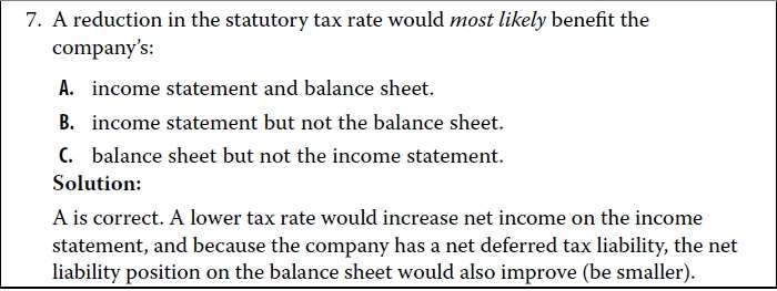 根据本页PPT的视频讲解,我的提问是:书P15-Question Set 2-Question 7-为什么法定税率的降低,能同时使损益表和资产负债表受益?Question 9的答案解析是什么意思?是在讲这个公式吗?income tax expense=tax payable+△ DTL-△ DTA