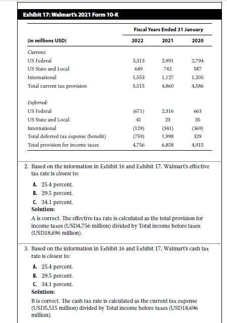 根据本页PPT的视频讲解,我的提问是:书P22-Question Set 3-Question 2-问walmart的effective tax rate,为什么用的是2022年的数据?不能用2021年数据?用2021年数据,求出的effective tax rate=33.34%, 用2020年数据,求出的effective tax rate=24.43% 。Question 3-cash tax rate=cash tax/EBT,分子是cash tax,为什么cash tax=加总的tax payable(即Exhibit 17中的total current tax provision)?加总的tax payable 是当期实际交给税务局的税吧,怎么成了cash tax?