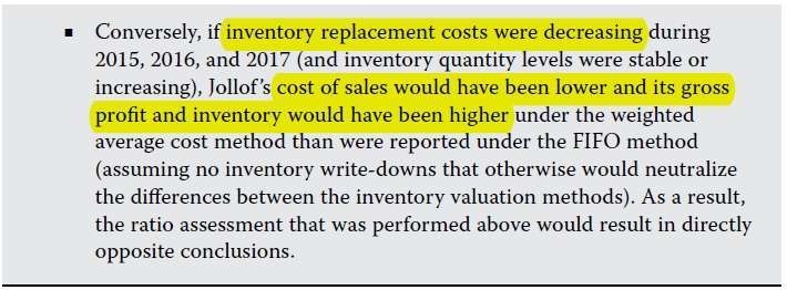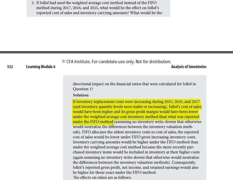 根据本页PPT的视频讲解,我的提问是:书P552-Example 4-Question 3-答案第一段,已知条件中哪里出现过replacement costs? 并且,为什么在加权平均下的COGS,会比FIFO下的COGS更高?请给出计算式。截图中标黄的这段话怎么理解?为什么inventory replacement costs上升,COGS也会上升?以及截图2,为什么replacement costs下降,COGS会变低,gross profit和inventory会变高?
