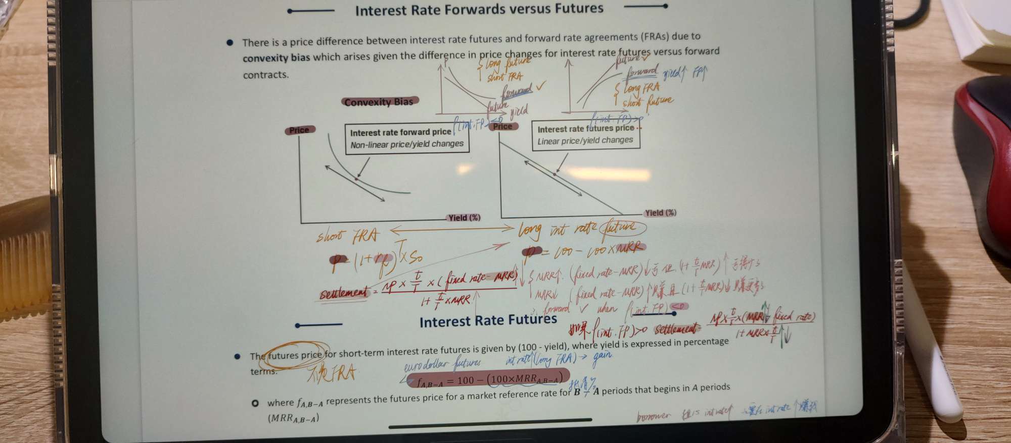 - 对于老师讲的这部分,1. 我理解FRA的Payoff始终等于利率期货的Payoff部分进行折现(除以1个大于1的数),也就是说,FRA的Payoff的变动幅度 应该 始终小于利率期货的变动幅度。2. 至于是涨多跌少,还是涨少跌多,其实MRR在分母上,可以根据1/x的曲线特点来理解,无非就是MRR上升时1/(1+MRR)的变动幅度 小于 MRR下降时1/(1+MRR)的变动幅度,所以如果MRR上升时,Payoff是上升的,那么就是涨少跌多,如果MRR上升时,Payoff是下降的,那就是涨多跌少。以上2点,我理解的对吗?