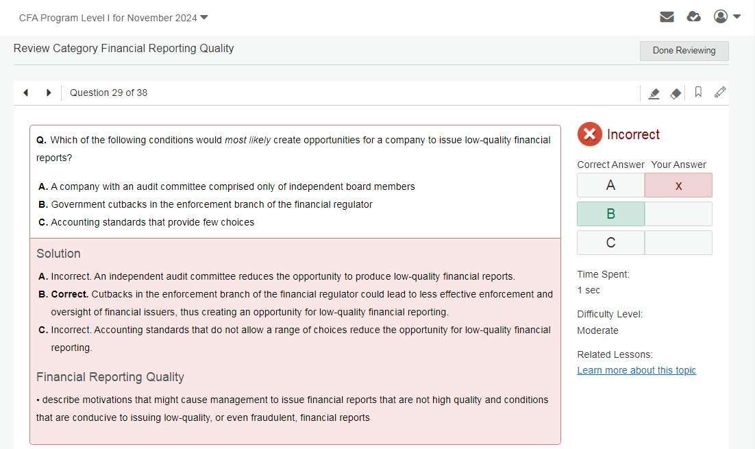 根据本页PPT的视频讲解,我的疑问是:官网习题-Question 29, A选项错在哪儿?难道不是本页PPT里所写的an ineffective board of directors?全部由独立董事构成的审计委员会,到底是有效的还是无效的?B选项和C选项,怎么理解?本页PPT没有?