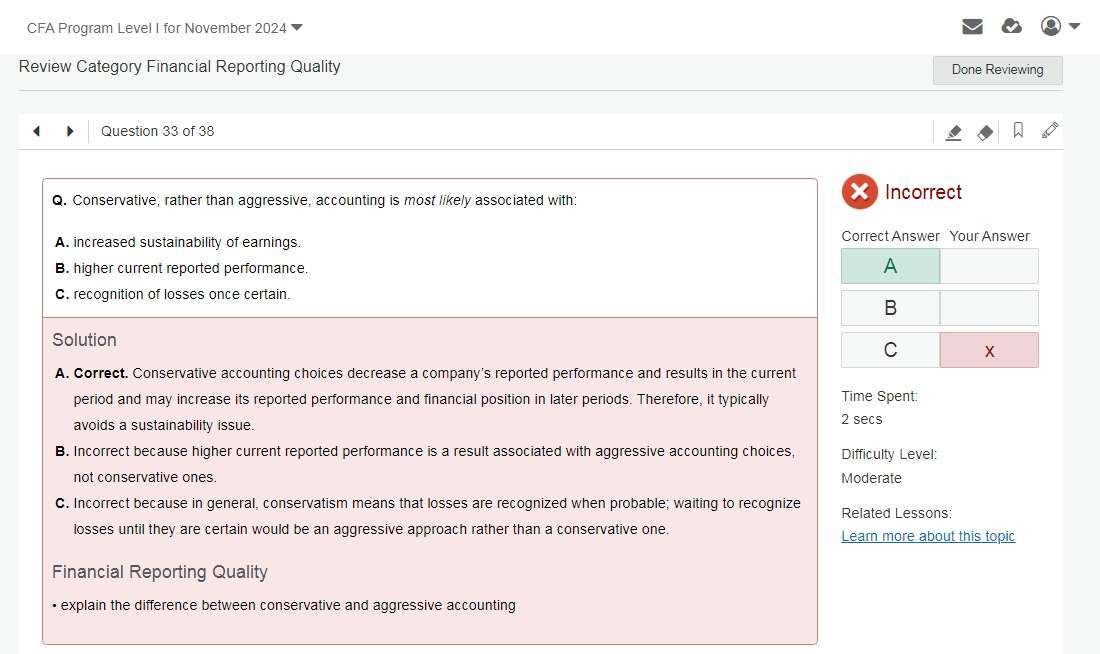 根据本页PPT的视频讲解,我的疑问是:官网习题-Question 33-C选项,recognition of losses once certain. 是什么意思?本页PPT不是写着delayed recognition of impairments属于激进做法,而early recognition of impairments属于保守做法?那么C选项中的等到确定了再确认减值,是delayed recognition of impairments还是early recognition of impairments?另外,A选项,有这种说法的?