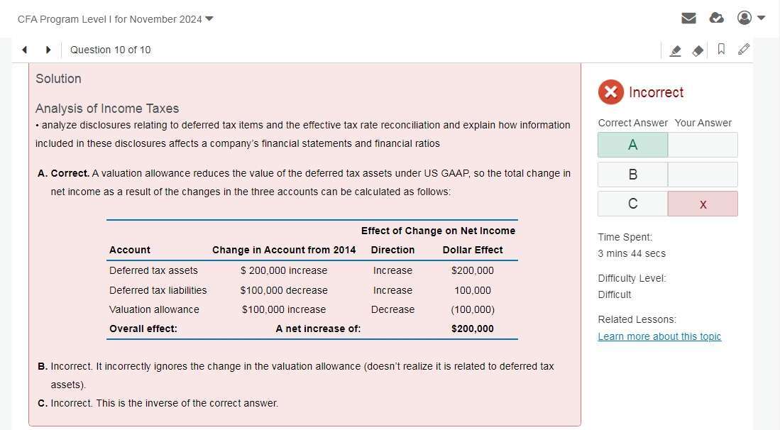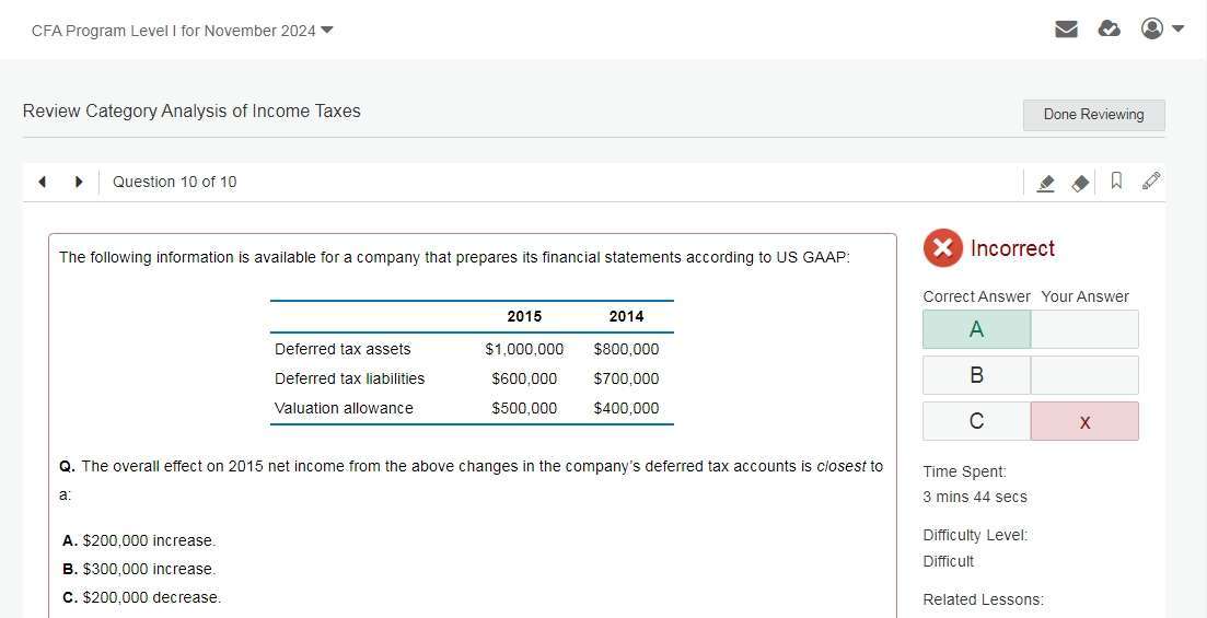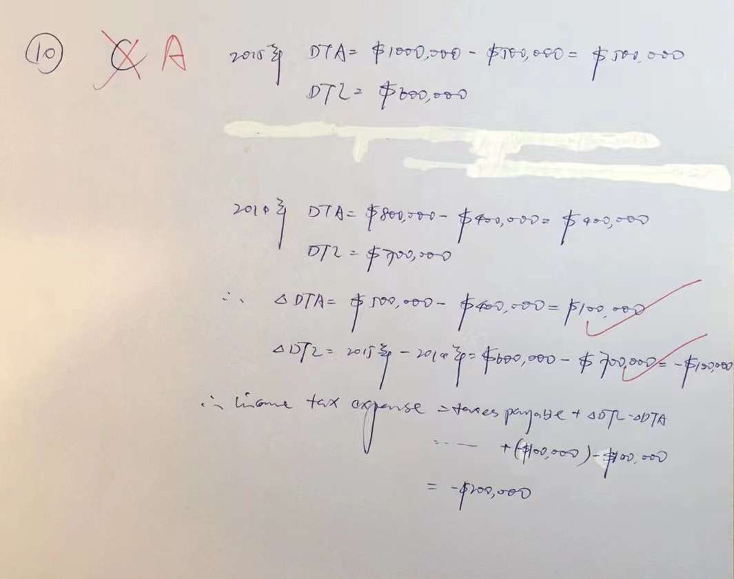 查看试题 已回答根据本视频的例题讲解,我的提问是:官网习题-Question 10-截图3是我的计算过程,△DTL不应该是-100,000吗?根据公式income tax expense=tax payable +△DTL-△DTA,我计算得出的△DTL=-100,000,而△DTA的=100,000,那么影响net income的变化量△DTL-△DTA=-100,000-100,000=-200,000,所以我选的是C- 200,000decrease. 哪里错了?