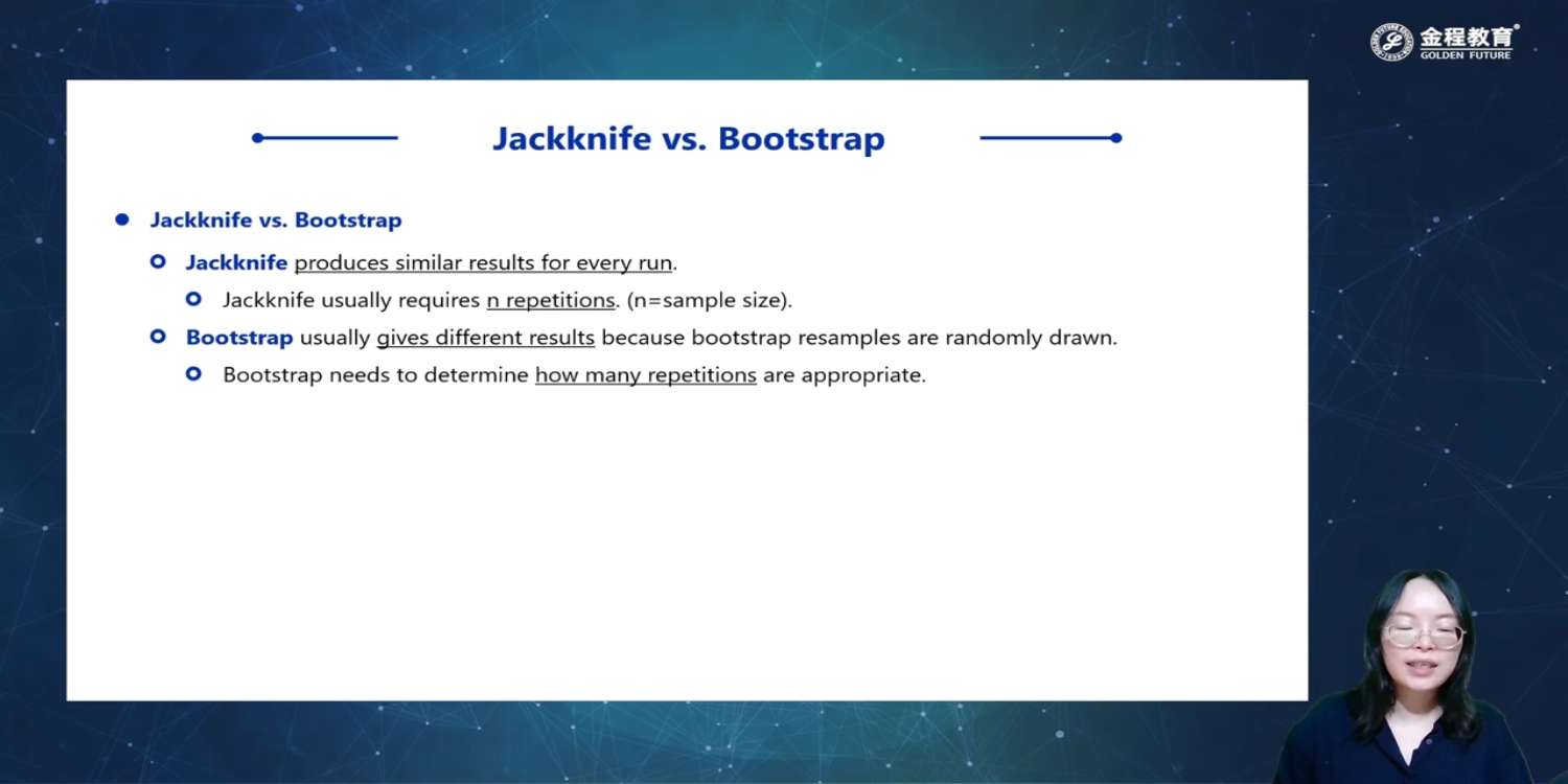 已解决请问 对于C的疑问 :jackknife 每一次抽样是随机砍掉一个 那有可能第一次和第二次砍掉的是同一个数 那么第一次和第二次得到的样本就是一样的了。 实际上分析师是会去掉这种一样的结果 并继续穷尽所有抽样结果 所以大家用Jackknife重抽样得到的结果是一致的。 是这么理解吗?