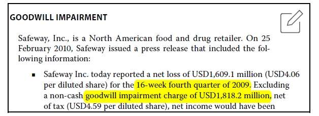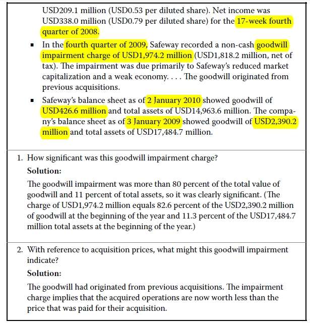 查看试题 已解决根据本页PPT的视频讲解,我的提问是:书P461-Question set-goodwill impairment-Question 1-这一问里的商誉减值金额为什么用的是the fourth quarter of 2009的数字,题干里还给了1818.2这个数字,为什么不用1818.2?The 16-week fourth quarter of 2009与the fourth quarter of 2009,与the 17-week fourth quarter of 2008,这3者的表述有什么区别?分母为什么用的是3 January 2009的数2390.2而不是2 January 2010的数426.6?