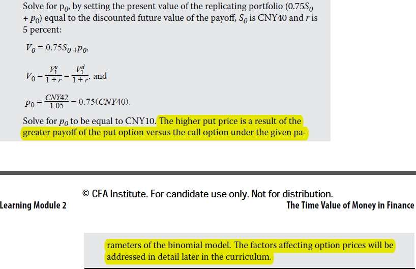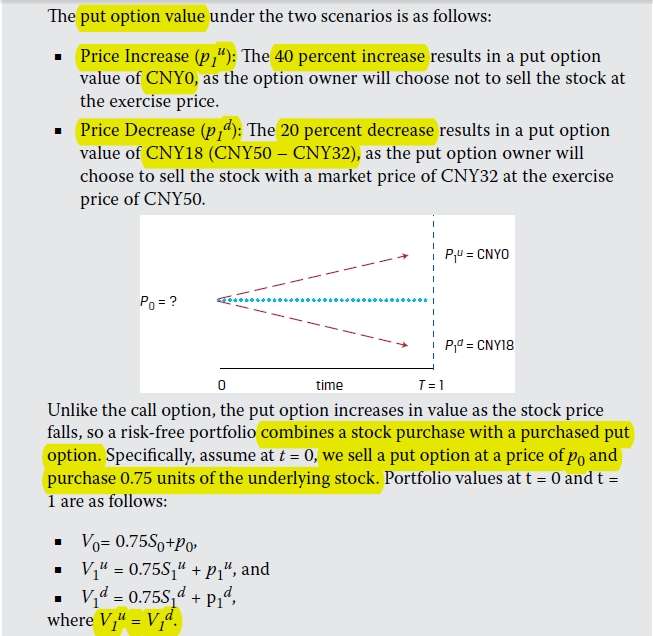 Module 2-书P79-Example 15-1.截图1,看跌期权价格上涨40%,为什么会导致value=0? 看跌期权价格下跌20%,为什么会导致value=50-32=18?2. 截图1,题干中说的combines a stock purchase with a purchased put option 什么意思?为什么既卖出看跌期权,又买入0.75 units的标的股票?为什么V1u必须等于V1d? 3. 截图2,最后一句标黄的句子,在给定的二项模型参数下,为什么看跌期权的收益高于看涨期权?