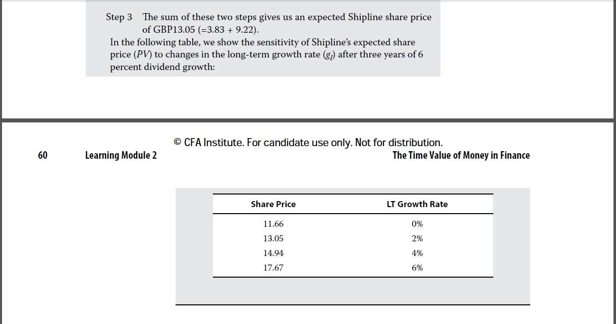 Module 2-书P59-Example 7-Question 2-1.Solution 中第5行标黄的这个计算式,能否用金融计算器一步按键得出?怎么按键?怎么按键,才能不需要像Step 1中的表格那样,把t0,t1,t2,t3每个时期的股利现值都分别算出来后再相加?2. Step 2最后一行标黄的这个公式,分母为什么是3次方,而不是4次方?分子难道不是t4第4期的股利吗?3. Step 3表格中的数据是否计算错误?LT Growth rate=0%时,总股利=3.83+[1.823/(0.15-0)/1.15^3]=11.82, LT Growth rate=4%时,总股利=3.83+[1.823/(0.15-0.04)/1.15^3]=14.72, LT Growth rate=6%时,总股利=3.83+[1.823/(0.15-0.06)/1.15^3]=17.15